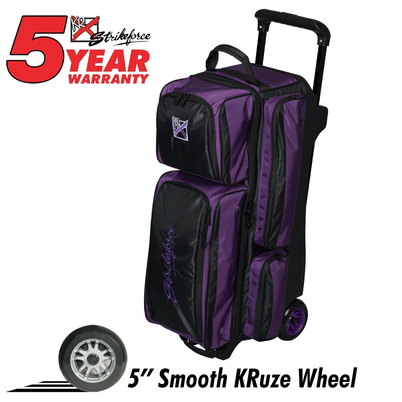 The Konvoy Triple Roller from KR Strikeforce is the ultimate accessory for avid bowlers who demand the best in performance and style. Made from durable 840D/600D fabric, this triple roller bag boasts large accessory pockets and end pick-up handles, making it a breeze to transport your bowling essentials to and from the lanes. It can even accommodate shoes up to size 15, so you don't have to worry about leaving any gear behind. Equipped with a retractable square locking handle that extends up to 43", this bag is easy to maneuver, even when fully loaded.